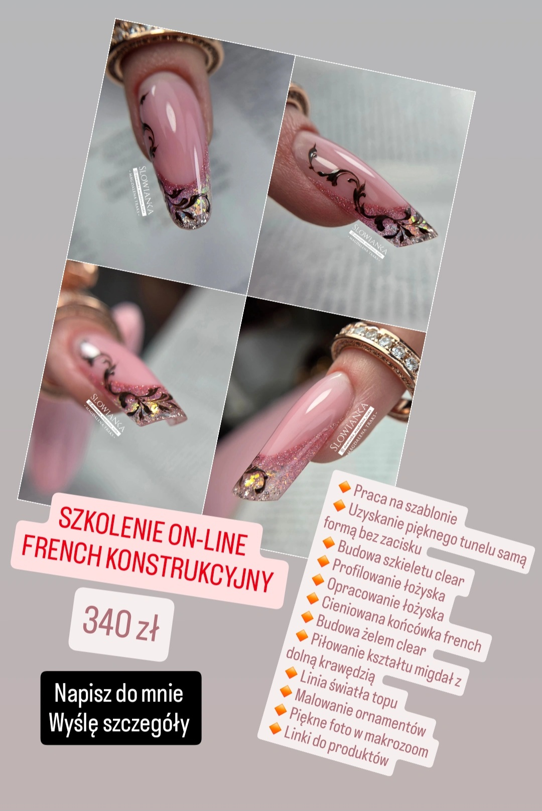 ▪️odpowiednim żelem clear najpierw wybudujesz szkielet, następnie żelem cover wydłużysz łożysko aby palce wyglądały smukło. Na końcówkę french nałożysz brokatowe hybrydy. Podpowiem Ci jakie kolory się ładnie łączą. Żelem clear wykonasz resztę paznokcia. Nauczę Cię piłować kształt migdał z dolną boczną stroną. Zrobisz delikatny wzorek i piękne fotki z obiektywem makrozoom. - Dezynfekcja sterylizacja