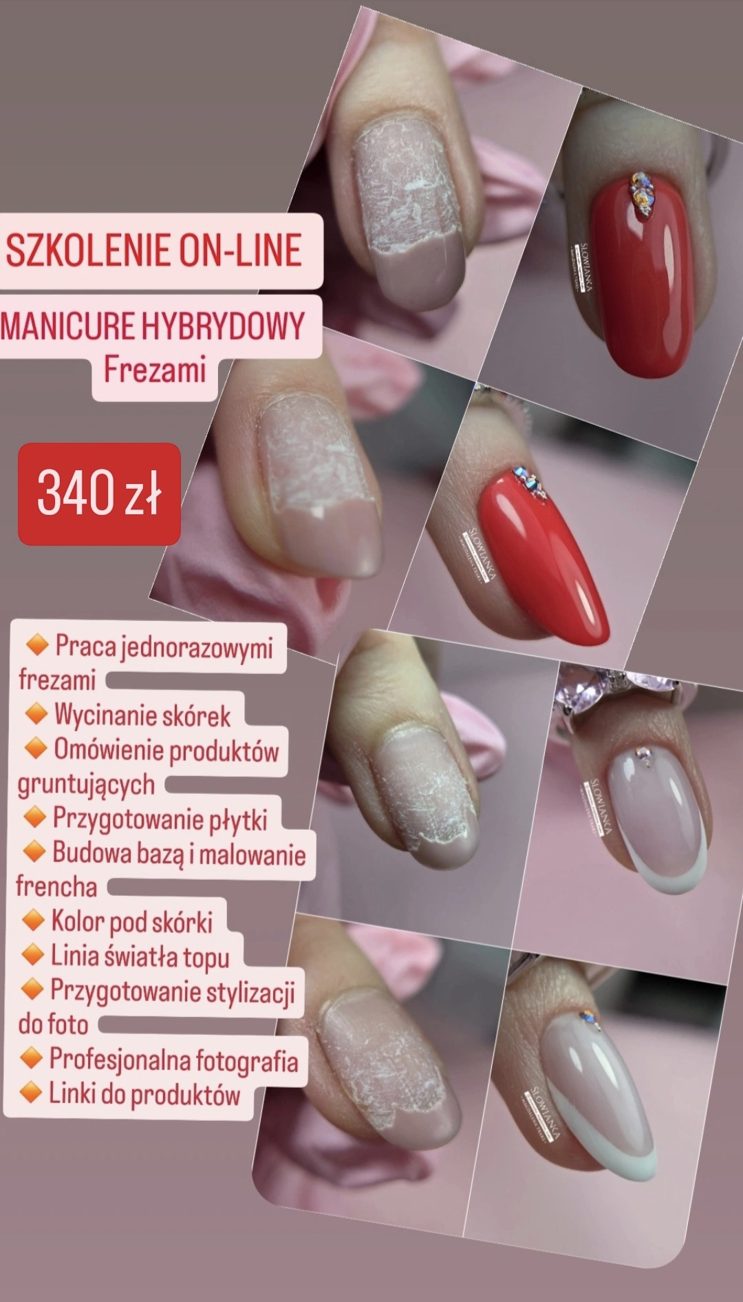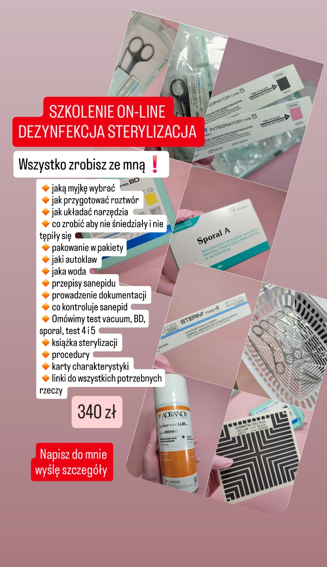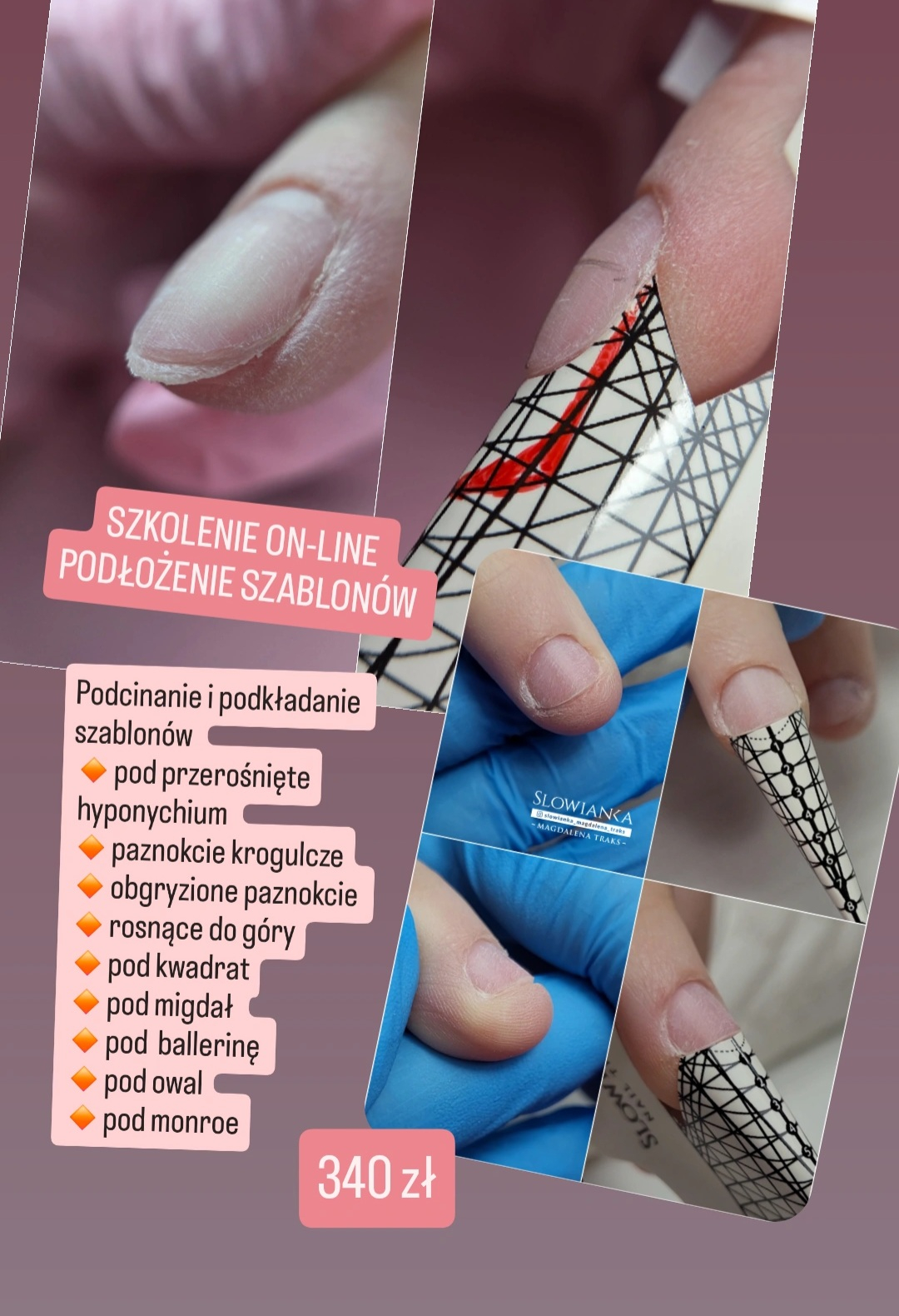 Omówimy wszystkie testy, które trzeba wykonywać. Wytyczne sanepidu przy kontroli. Jakie dokumenty trzeba mieć. Jak prowadzić książkę sterylizacji. Wyślę Ci procedury i gdzie znaleźć karty charakterystyki. Wykonasz ze mną proces dezynfekcji w myjce, spakujesz narzędzia w pakiety i wykonasz sterylizację w autoklawie. Podpowiem Ci jaką myjkę i autoklaw wybrać. Wyślę linki do potrzebnych produktów. Będziesz umiała wszystko. - Podkładanie szablonów pod kształty migdał, kwadrat, owal, ballerina, zwężony kwadrat. Trudne przypadki, płytka krogulcza z przerośniętym hyponychium, rosnąca do góry z głębokimi punkami wzrostu.
